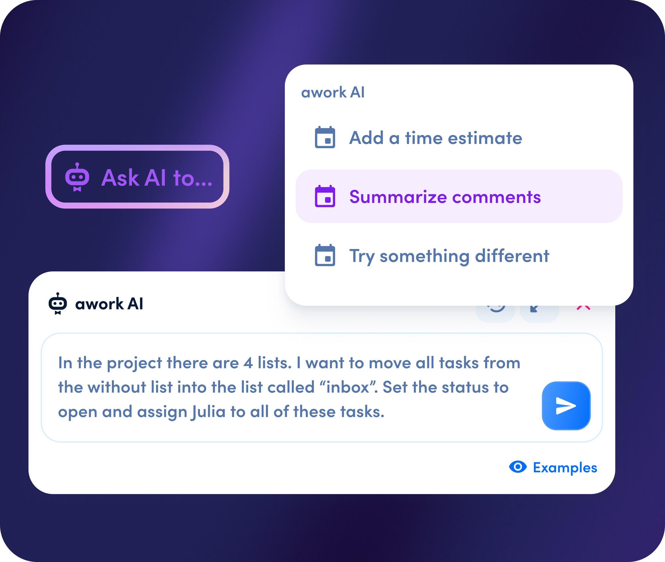 If awork AI is introduced at moments of highest user intent and powered by pre-filled, context-aware prompts—users can engage instantly, reach value faster, and build a habit of returning to the feature organically. High-intent moments » Within a project: surface prompts to identify blockers, generate summaries, or assess project status. » Within time tracking: offer prompts such as Weekly Time Report or Missing Time Check to support quick, task-driven insights.