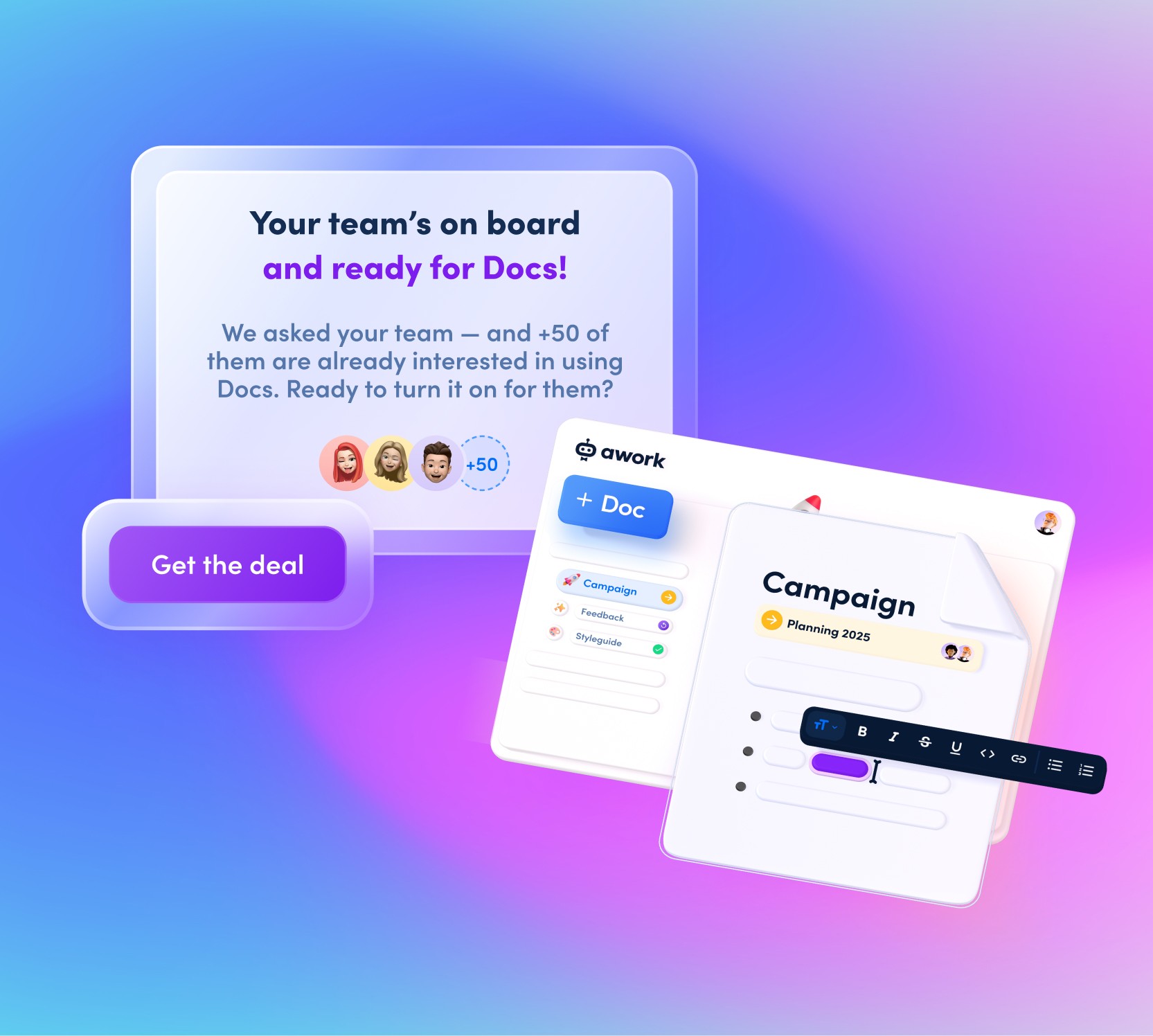 Docs is a collaborative documentation feature that allows customers at awork organize, and edit content directly inside their workspace. Instead of relying on external tools like Notion. Helping teams centralize information and reduce fragmentation across tools.